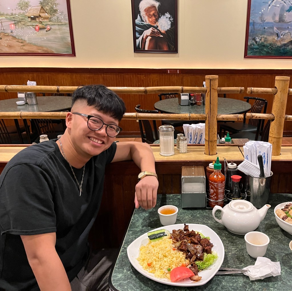 Lifu enjoying Beef Cubes with Fried Rice at Nam Sơn, a Vietmenese Restaurant in Chinatown, Manhattan.
